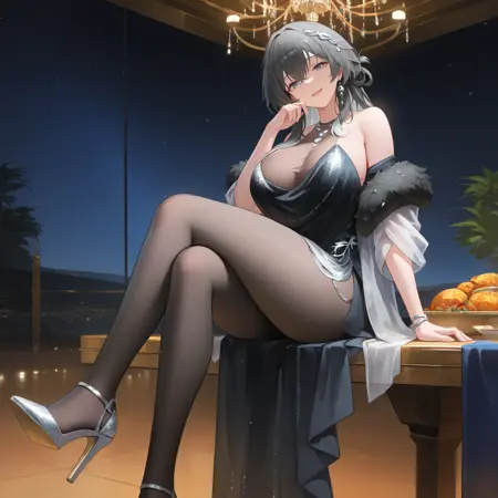ParvatiAG, Prv_Drs, 灰色头发, 渐变发色, 裸露肩膀, 吊带连衣裙, 吊领, 透视胸线, 黑色全身丝袜, 无袖全身丝袜, 黑色连裤袜, 连裤袜, 黑色连衣裙, 露肩外套, 晚礼服, 腹链, 黑色毛皮, 毛皮镶边, 毛皮镶边夹克, 银色镶边, 白色夹克, 银色项链, 开放式服装, 透视外套, 银色手镯, 袖子超过肘部, 透视袖子, 头饰, 银色鞋履, 高跟鞋, 鞋带,