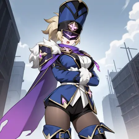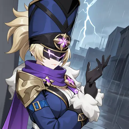 OprichnikiTG, 金色头发, 马尾辫, 眼罩, 遮住眼睛, 面具, 高帽, 帽子, 军装, 蓝色头饰, 黑色镶边, 徽章, 紫色围巾, 蓝色夹克, 紫色斗篷, 白色毛皮镶边, 白色毛皮, 肩章, 单侧肩甲, 白色衬衫, 衬衫, 黑色短裤, 高腰短裤, 短裤, 棕色连裤袜, 短裤下的连裤袜, 白色腰带, 紫色宝石, 蓝色袖子, 长袖, 大腿靴, 黑色鞋履, 蓝色大腿腰带, 腰带靴, 毛皮镶边袖子, 黑色手套, 手套,