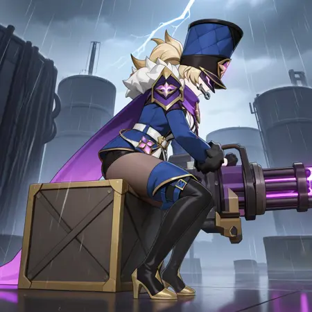可选: 为使迷你机枪出现,请添加 "weapon, gatling gun, dual wielding, mechanical hands, minigun, arm cannon," 并移除 "fur-trimmed sleeves, black gloves, gloves,"