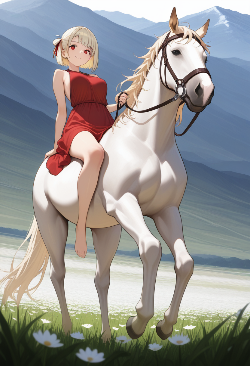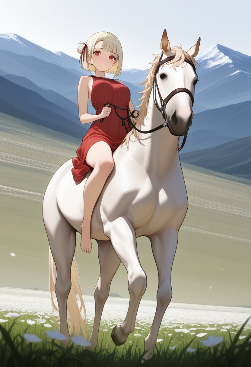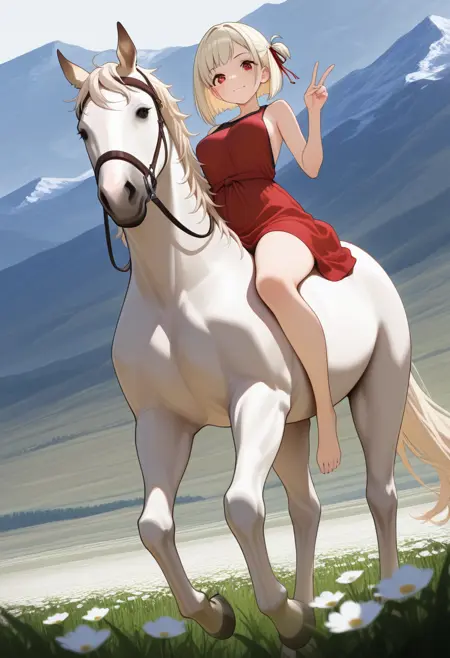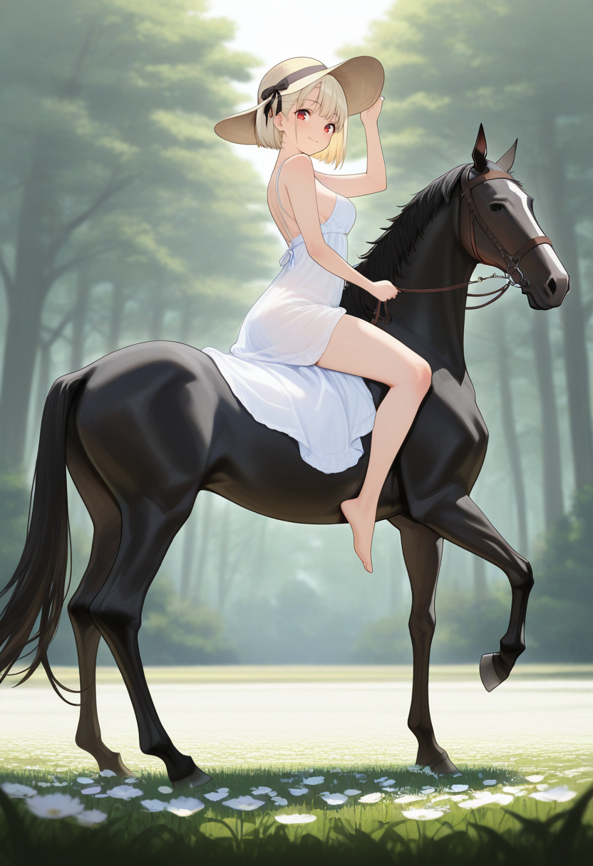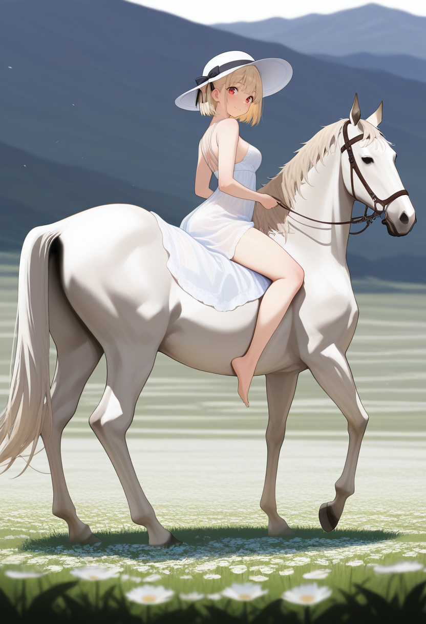 辅助标签:1girl,骑马,无鞍骑马,手握缰绳,马站立