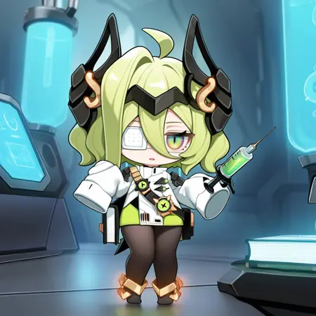 KleinHi3, gradient eyes, green hair, ahoge, chibi, eyepatch, headgear, hair ornament, metal hairband, black hairband, shoulder bag, book, gold belt, black belt, white coat, coat, white sleeves, lab coat, sleeves past fingers, tail, petite, green skirt, eye (symbol), black pantyhose, anklet,