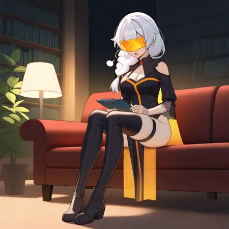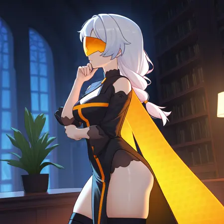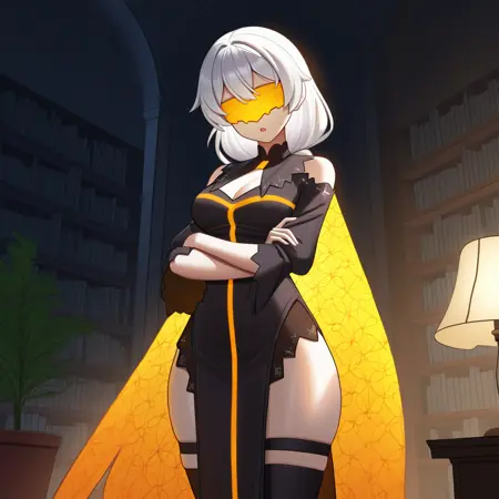 AmberHi3, orange eyewear, goggles, white hair, long hair, braided ponytail, black gorget, cleavage cutout, covered eyes, nun outfit, black dress, see-through cape, orange cape, thigh boots, black footwear, multiple thigh straps, orange trim, pelvic curtain, black sleeves, sleeves past elbows, wide sleeves, bare shoulders, shoulder cutout,