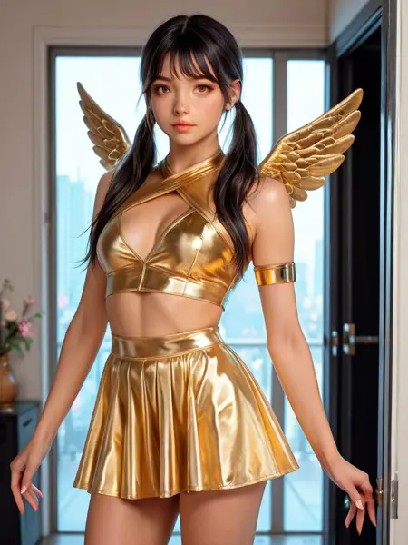 Triggers; Gld4ng3l, gold skirt, gold dress, crop top, miniskirt, fake wings, mini wings, gold wings, armlet, cleavage cutout,