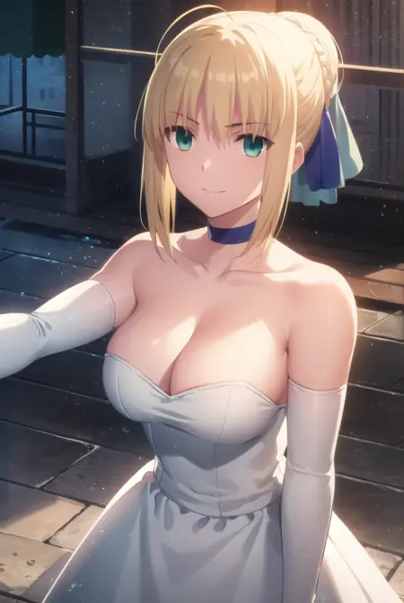 手套,连衣裙,蝴蝶结,丝带,露胸,露肩,马尾,项圈,肘部手套,(白色连衣裙:1.5),无肩带,无肩带连衣裙,