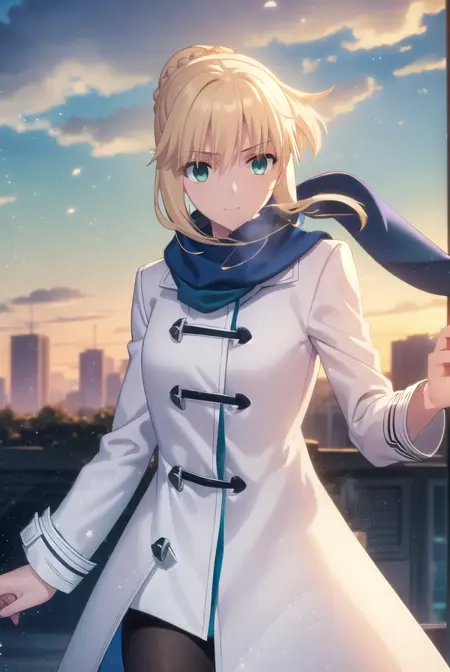 发髻,单发髻,辫子,裙子,丝袜,围巾,外套,(蓝色围巾:1.5),(白色外套:1.5),