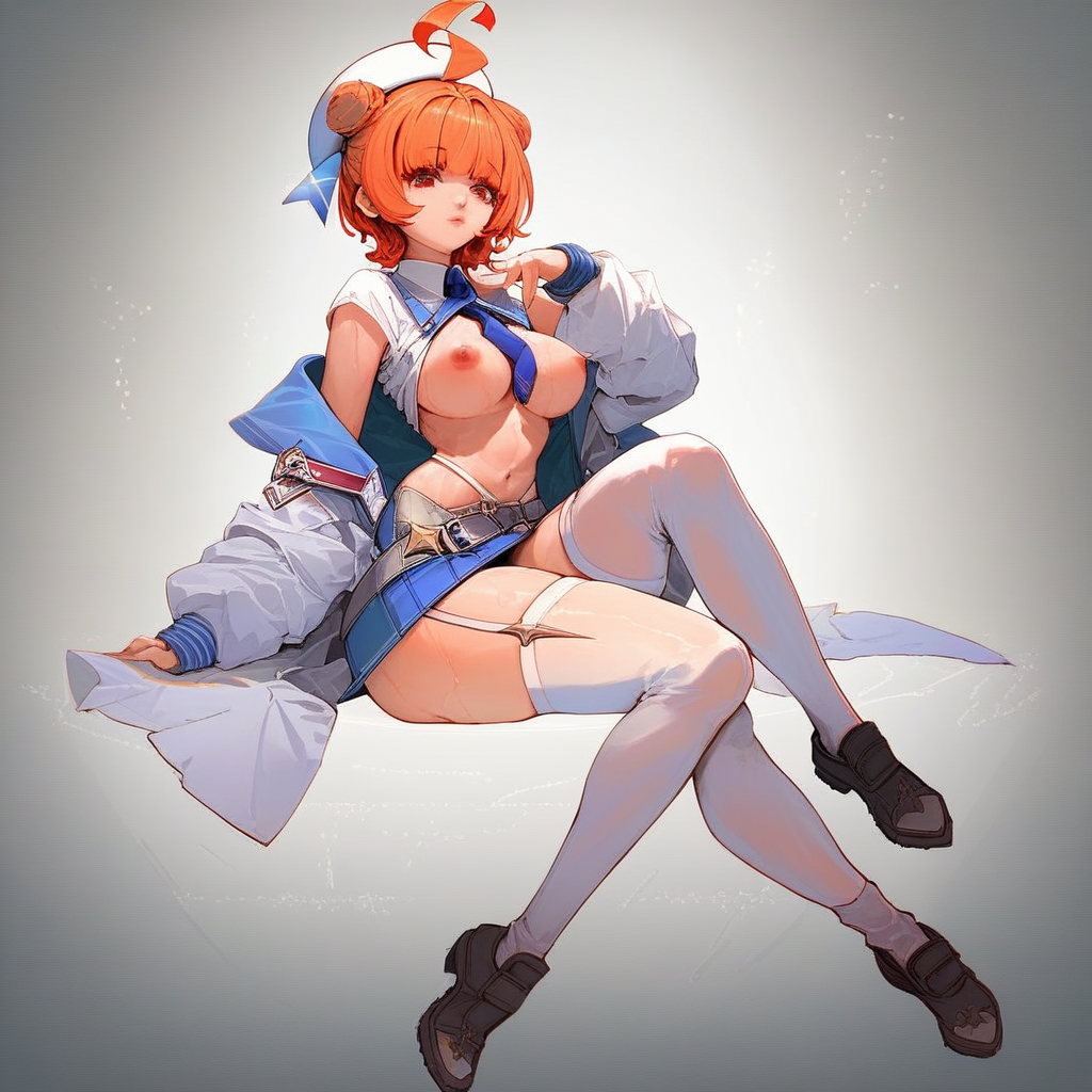 (VTuber_ゆめの, 短髪, ヘアバン, 赤髪, 前髪, アホ毛, オレンジ髪, 赤い目, 帽子, ジャケット, ネクタイ, シャツ, おへそ, スカート, ベルト, ガーター straps, レッグウォーマー, 靴),