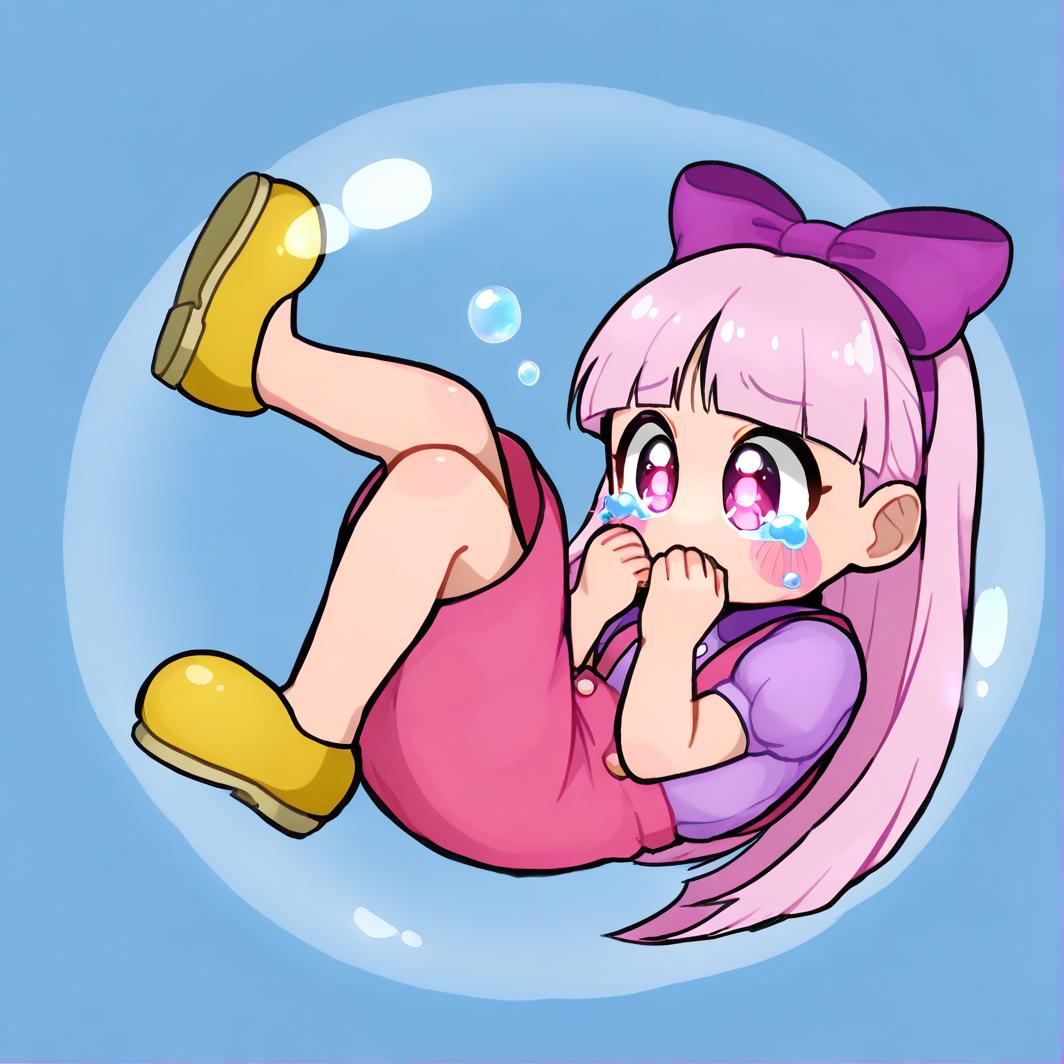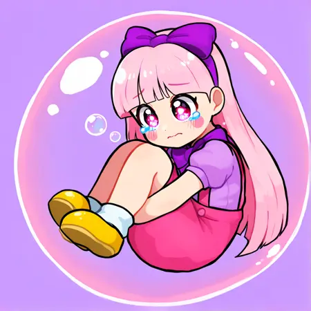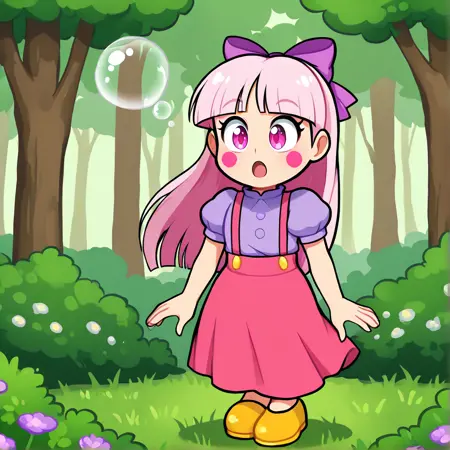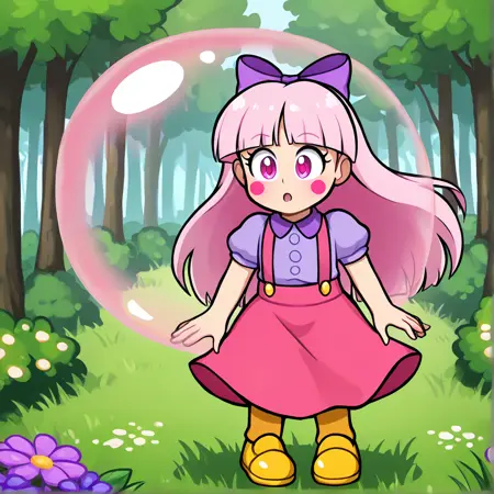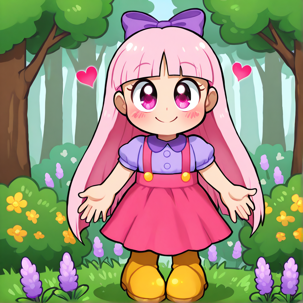 judy, long hair, magenta bow, suspender dress, pink dress, yellow shoes, pink eyes, pink cheeks, lavender shirt, light pink hair, blunt bangs, yellow buttons, short sleeves