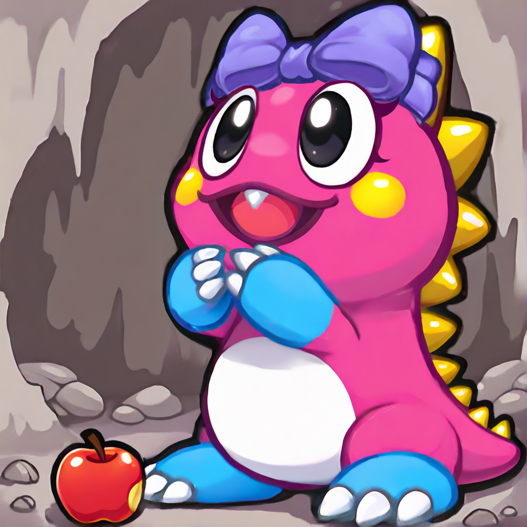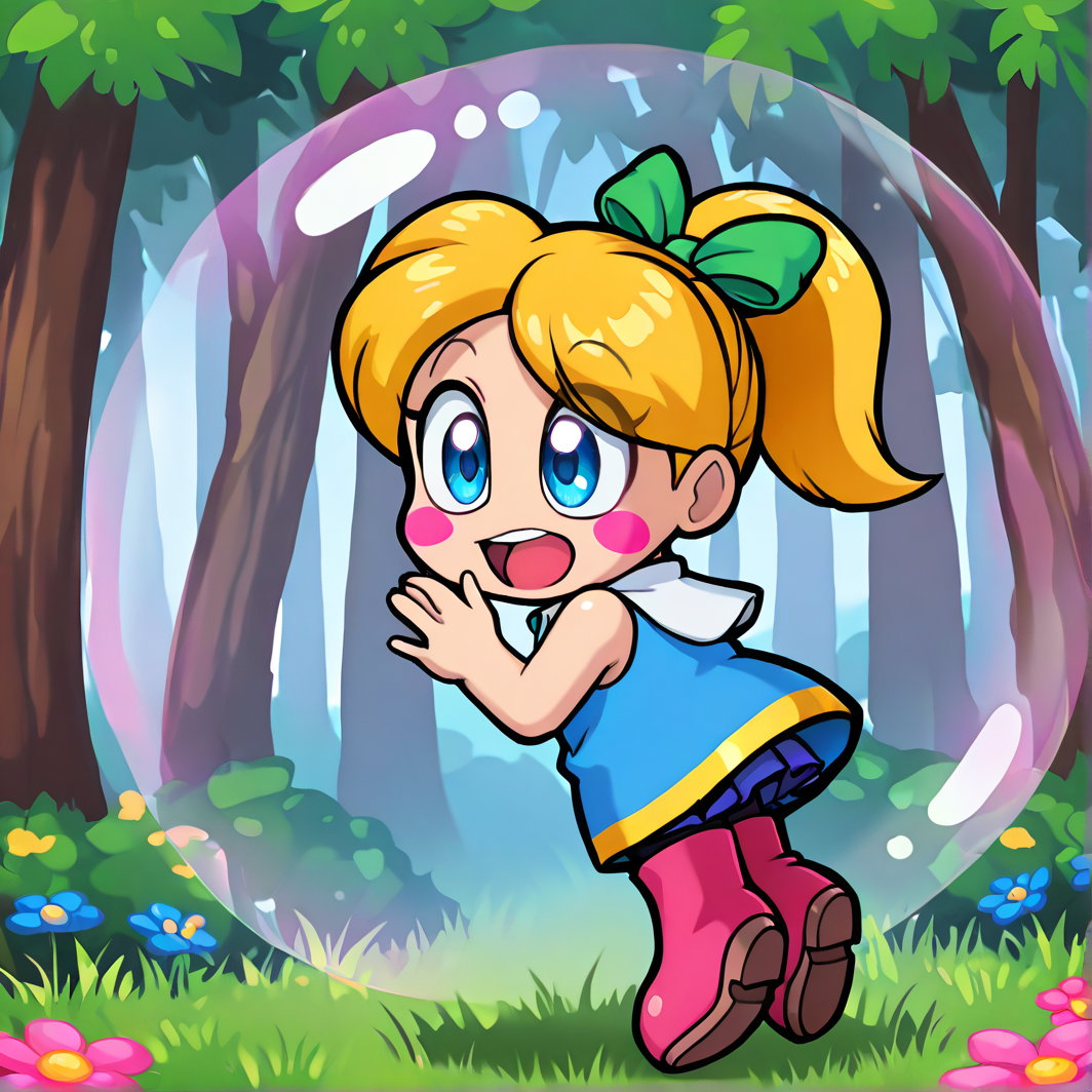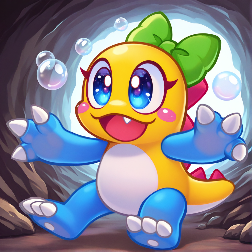 Well since there are absolutely zero Bubble Bobble characters on this site I decided to add a few. It was a lot of work! I had to edit sprites and draw concept art to even make this work. It's Patty, Betty, Peb and Pab from Bubble Bobble Symphony. I also included Judy who had ZERO concept art. I had to draw her based on her tiny NES sprite!