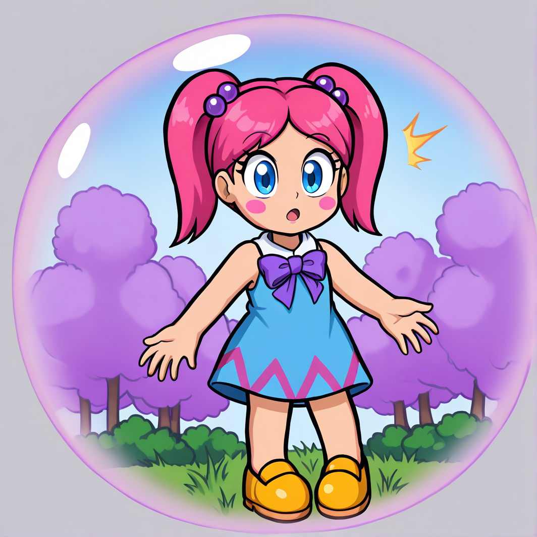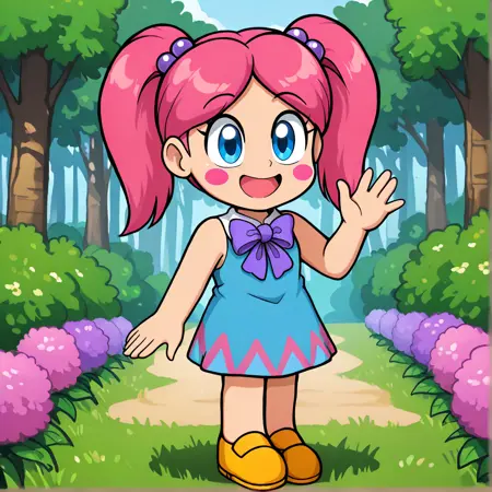 patty, pigtails, blue eyes, purple bow, blue dress, white collar, purple marble hair tie, yellow shoes, pink hair, pink cheeks, pink zigzag pattern on skirt, bow under collar, sleeveless