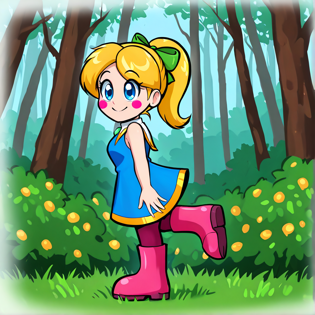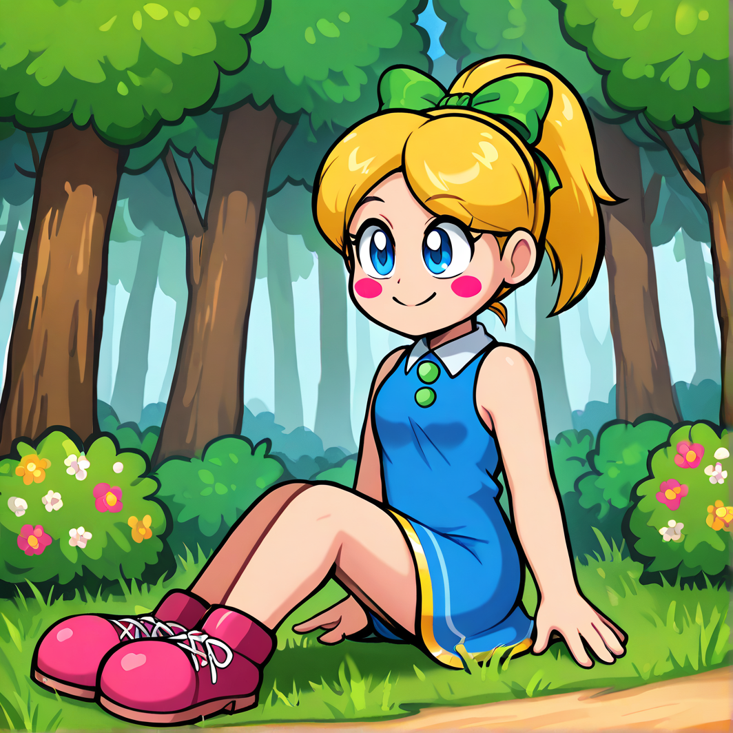 betty, blonde hair, ponytail, green ribbon, ((green button)), white collar, pink shoes, skirt with yellow trim, blue eyes, pink cheeks, button under collar, blue dress, sleeveless, (vibrant colors)