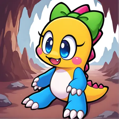 peb, (yellow body), white stomach, pink cheeks, fang, green bow, blue arms, claws, spikes, blue eyes, (blue legs)