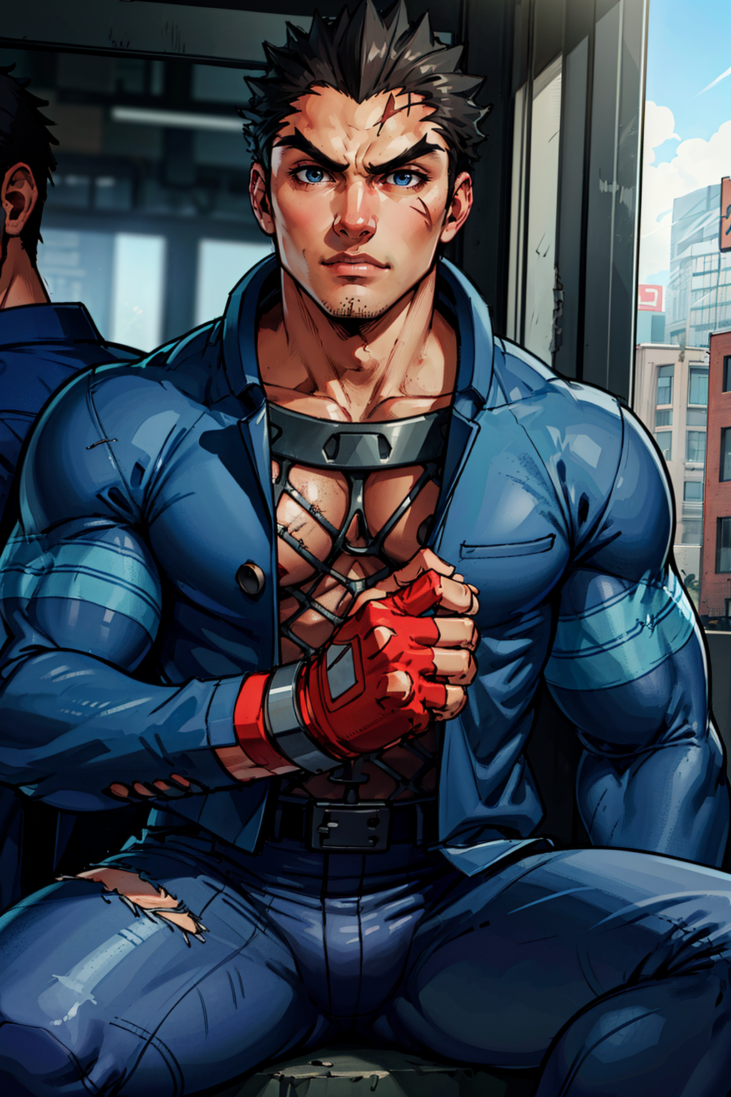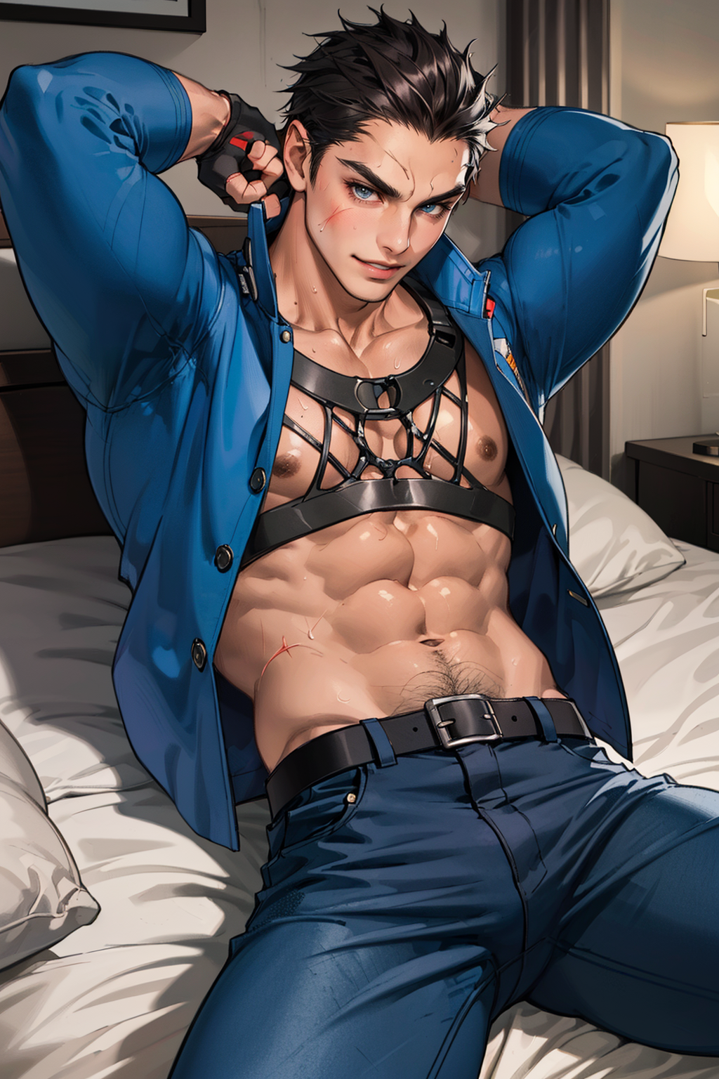 Model is a bit tricky, avoid many negative prompts. It's hard to keep his jacket buttoned, sorry for that :P But the fishnet shirt usually shows up if you prompt it.