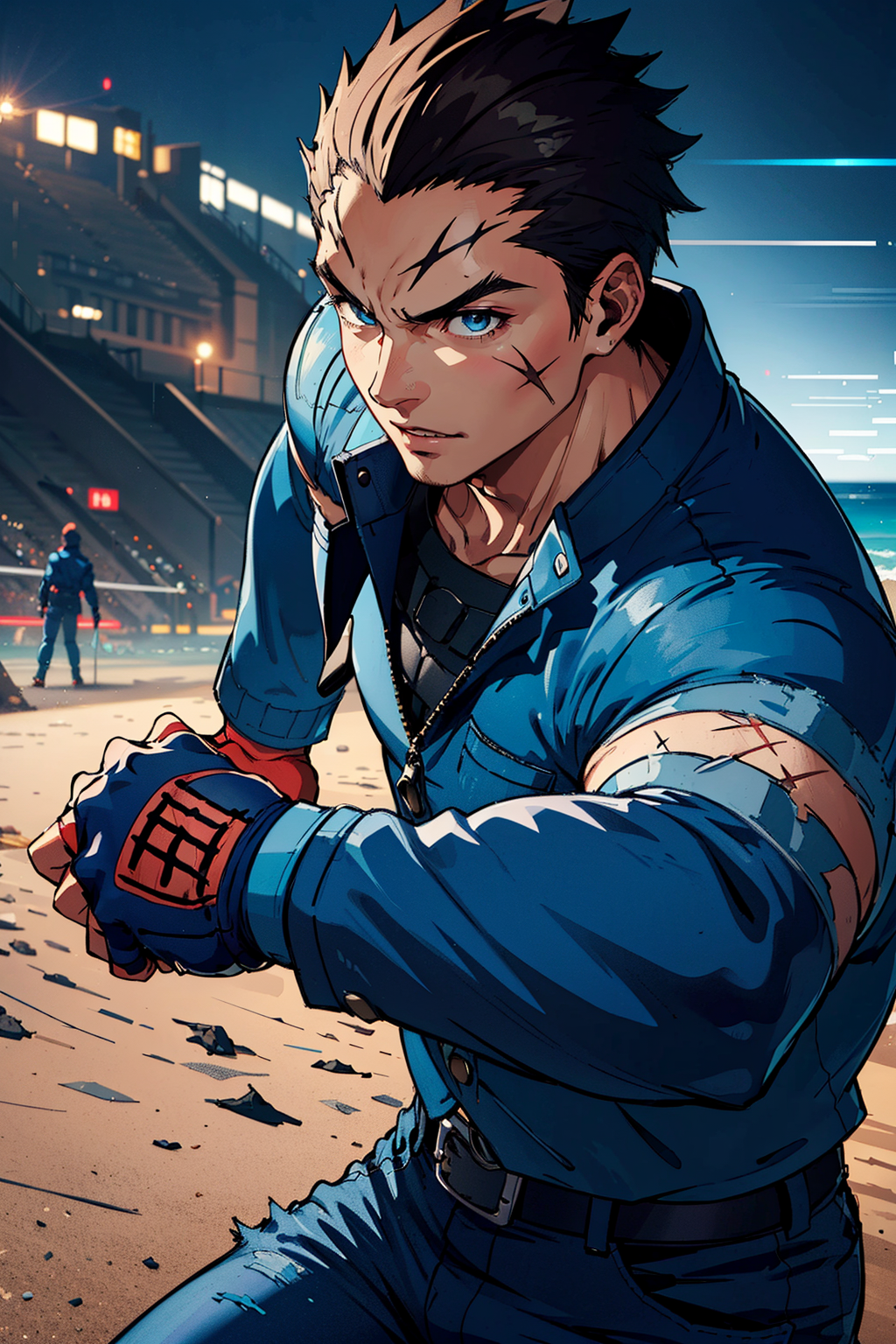 also: blue jacket, fishnet shirt/top/tanktop, collar shirt (so the fishnet shirt gets complete), scar/scar on face, blue pants, socks, sneakers, fingerless gloves