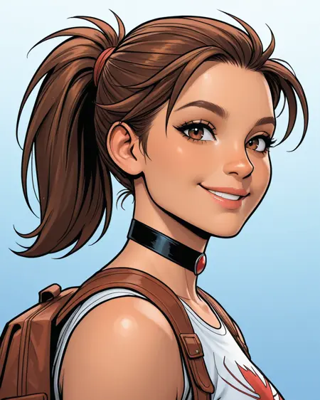 トリガー: _anyacoriginal, 茶色の髪, ポニーテール, チョッカー, タンクトップ, リュックサック, パンツ, ゆったりした赤いベルト, バッグ, 指なし手袋, ゴーグル, タイントされた眼鏡, タトゥー, 目なし,