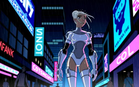 主要服装: 深紫色与黑色两件套,无袖上衣配迷你裙,手臂、躯干和大腿处有分段式亮紫色金属装甲,胸前有圆形徽章。