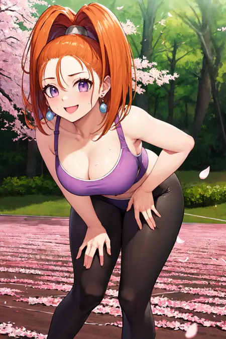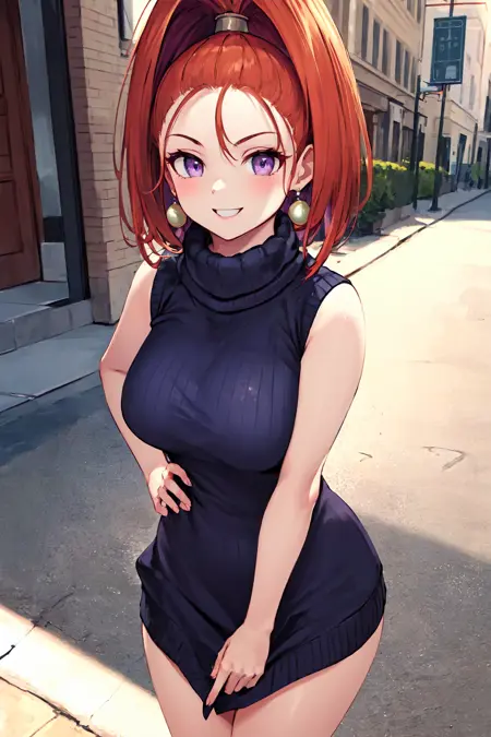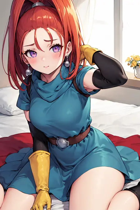 - barbara \(dq6\),purple eyes,orange hair,long hair,high ponytail,earrings,(cape:1.2),(light blue dress:1.4),belt,elbow gloves,(yellow gloves:1.2),(socks:1.1),boots