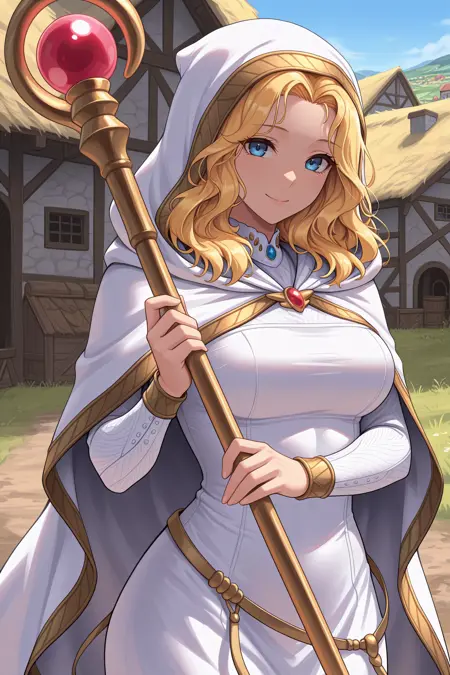 Add "brooch, white cloak, hooded cloak, hood up, white dress, long dress, long sleeves" for her typical look.