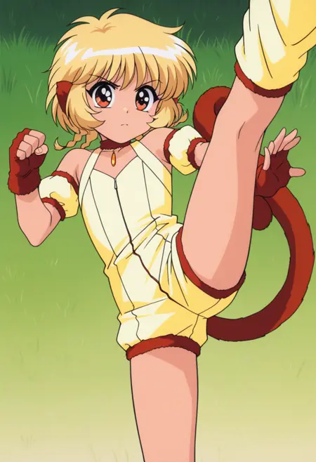 Mew 퍼딩 외모: 1girl, 짧은 머리, 금발, 빨간 눈, 동물 귀, 꼬리, 원숭이 귀, 원숭이 꼬리, 평평한 가슴, 주황색 눈, 쌍머리끈, 머리끈