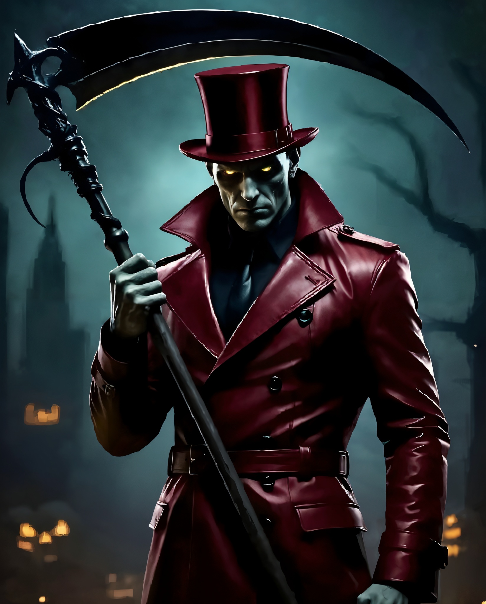 彼は、木々が彼の通り過ぎるたびに後退するかのように見える歪んだ森を静かに歩く。彼の周囲では、刻まれたカボチャが不気味で知的な笑みを浮かべ、その光が彼のコートに黒曜石に火が反射するように映し出される。彼を追う囁き——長い昔に結ばれた契約の噂が広がっている。その契約により、彼ははるかに貴重なものを犠牲にすることで永遠の力を得たという。