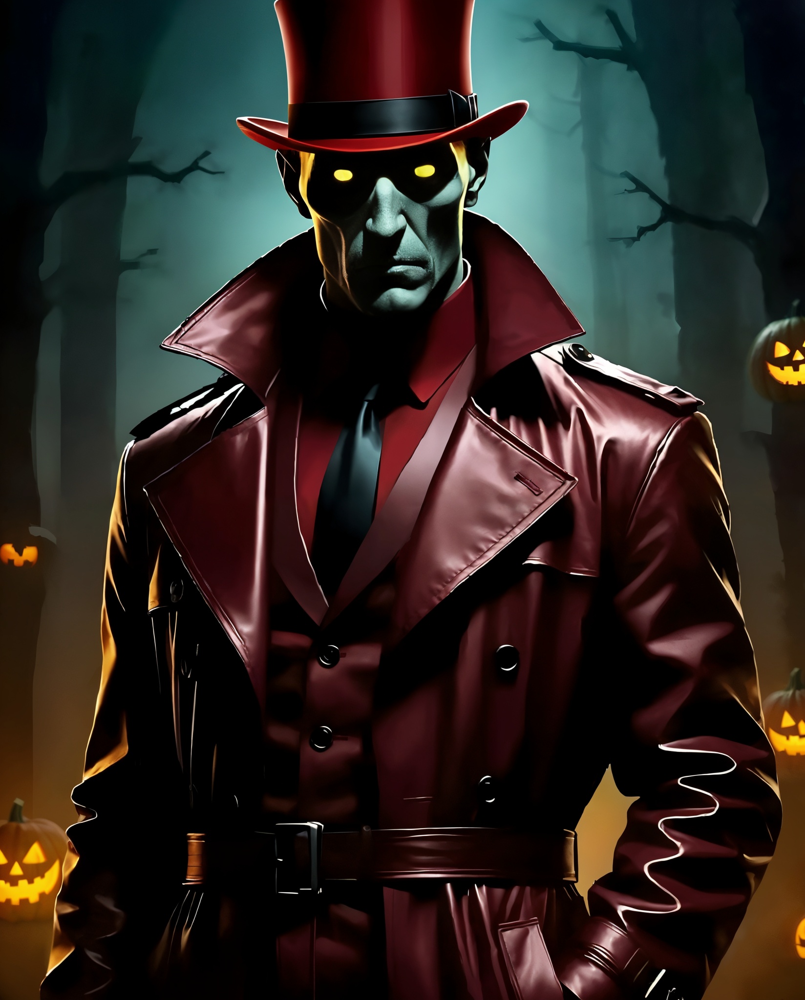 ジノス・ラウフェンダルケンは、世界の帷幕が薄れるときにのみ現れる、不気味で謎めいた存在である。このハロウィンの姿では、彼の丸禿げた頭は月明かりに faintly きらめき、輝く黄色い目が溶けた金のように闇を切り裂く。完璧に仕立てられたスーツとネクタイの上に、スリムなブラックのトレンチコートを羽織り、彼は冷たく威圧的な存在感を放つ——洗練と脅威が不安定に混ざり合った姿である。