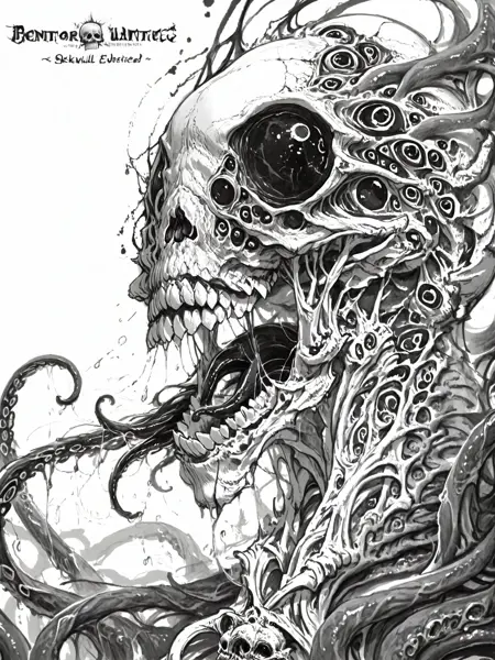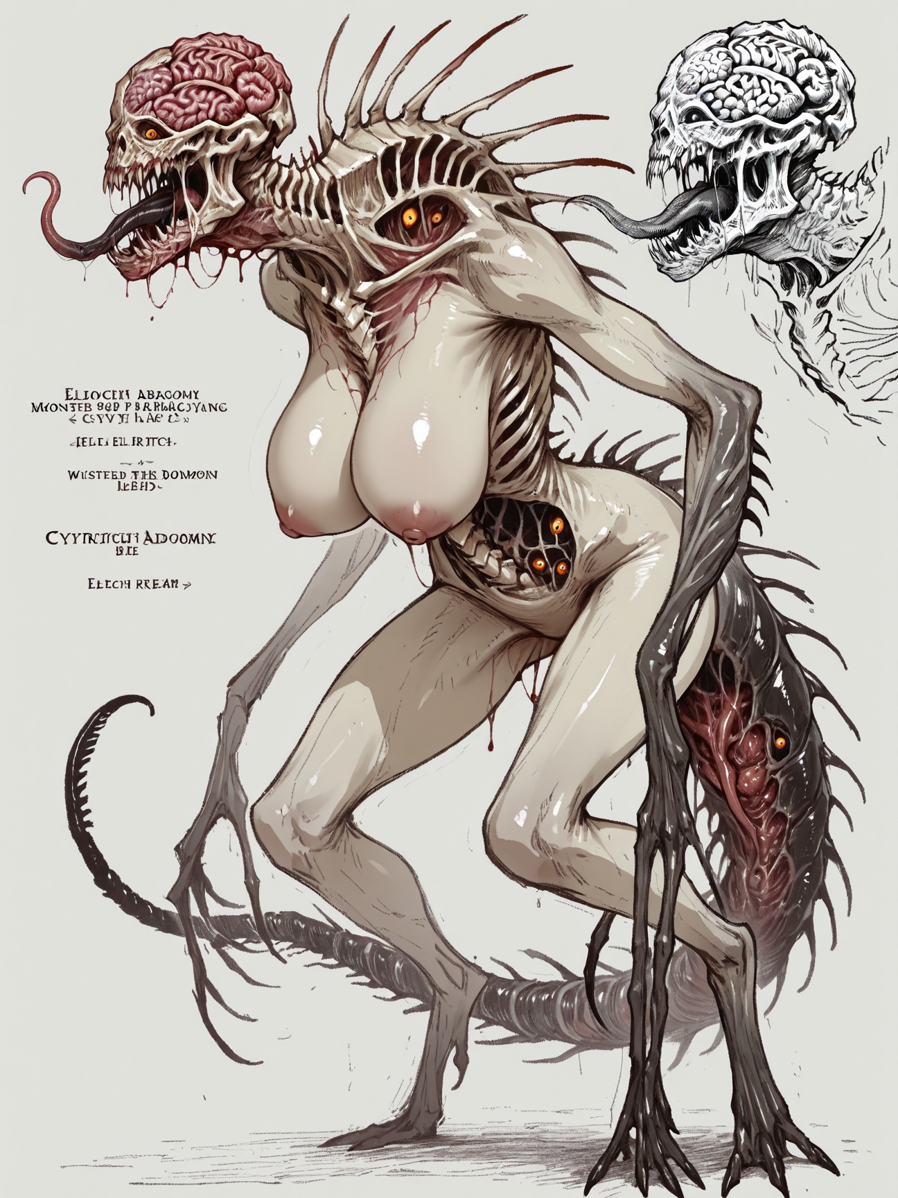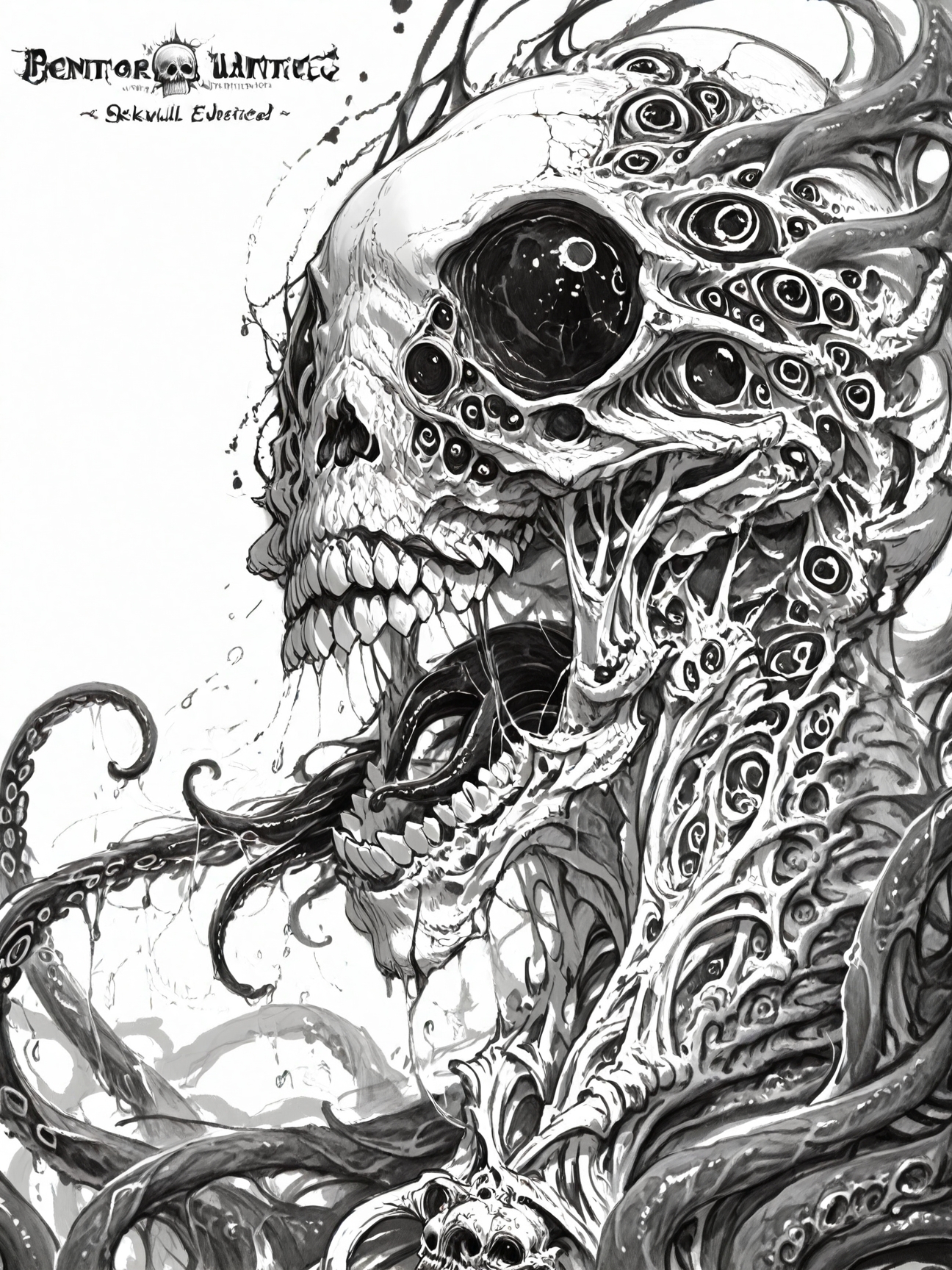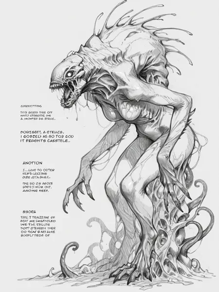 eldritch abomination, horror creature, eldritch anatomy, cryptic writing, yellowed parchment, demon, monster, tentacles, skull, claws, sharp teeth, extra eyes, extra arms, open mouth, weapon, glowing eyes, red eyes, torn clothes, cloak, demon horns