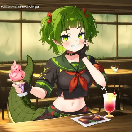 短い袖, アームバンド, セーラー collar, 赤いネッカチーフ, 鱷魚の尾, 緑の尾, 腹部, へそ, 1girl, ソロ, レイジーなポーズ, アニメスタイル, アニメスクリーンショット