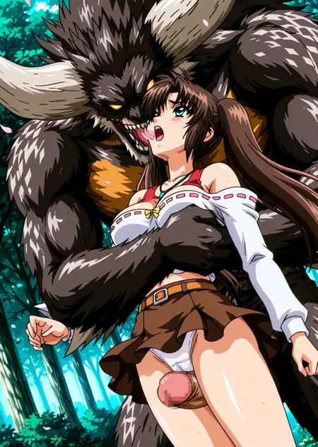 MiyuCas、茶色の髪、ツインテール、茶色のスカート、赤いタンクトップ、白いオフショルダーのトップス、長袖