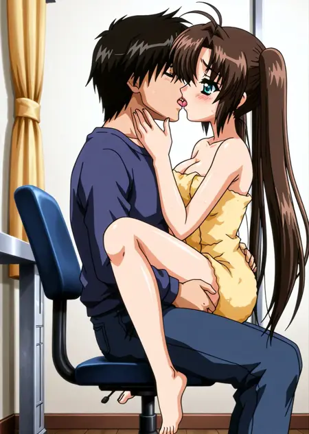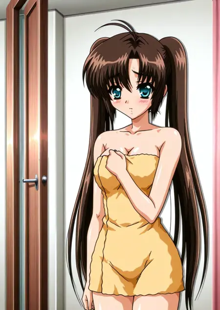 MiyuCas、茶色の髪、ツインテール、黄色のタオル、裸のタオル