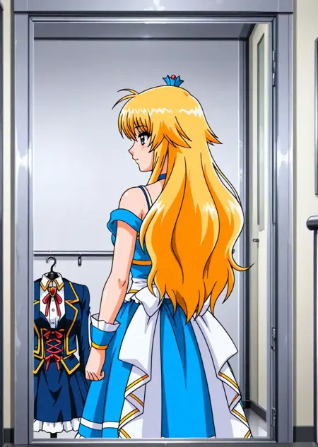 ReinaCas、金髪、ロングヘア、制服、青いジャケット、青いスカート、白いブラウス、赤いネクタイ