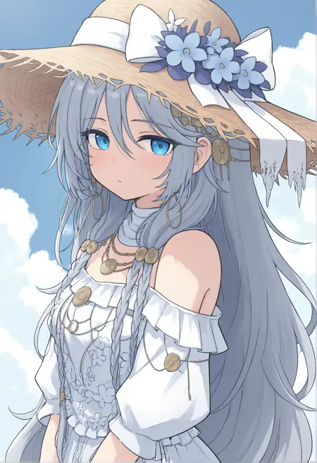 基本トリガー語:1girl, solo, long hair, blue eyes, grey hair, hair ornament, closed mouth, hair between eyes, very long hair, flower, blush, jewelry, earrings, hair flower
