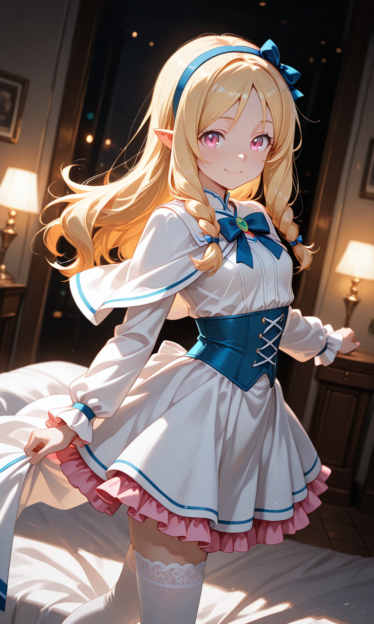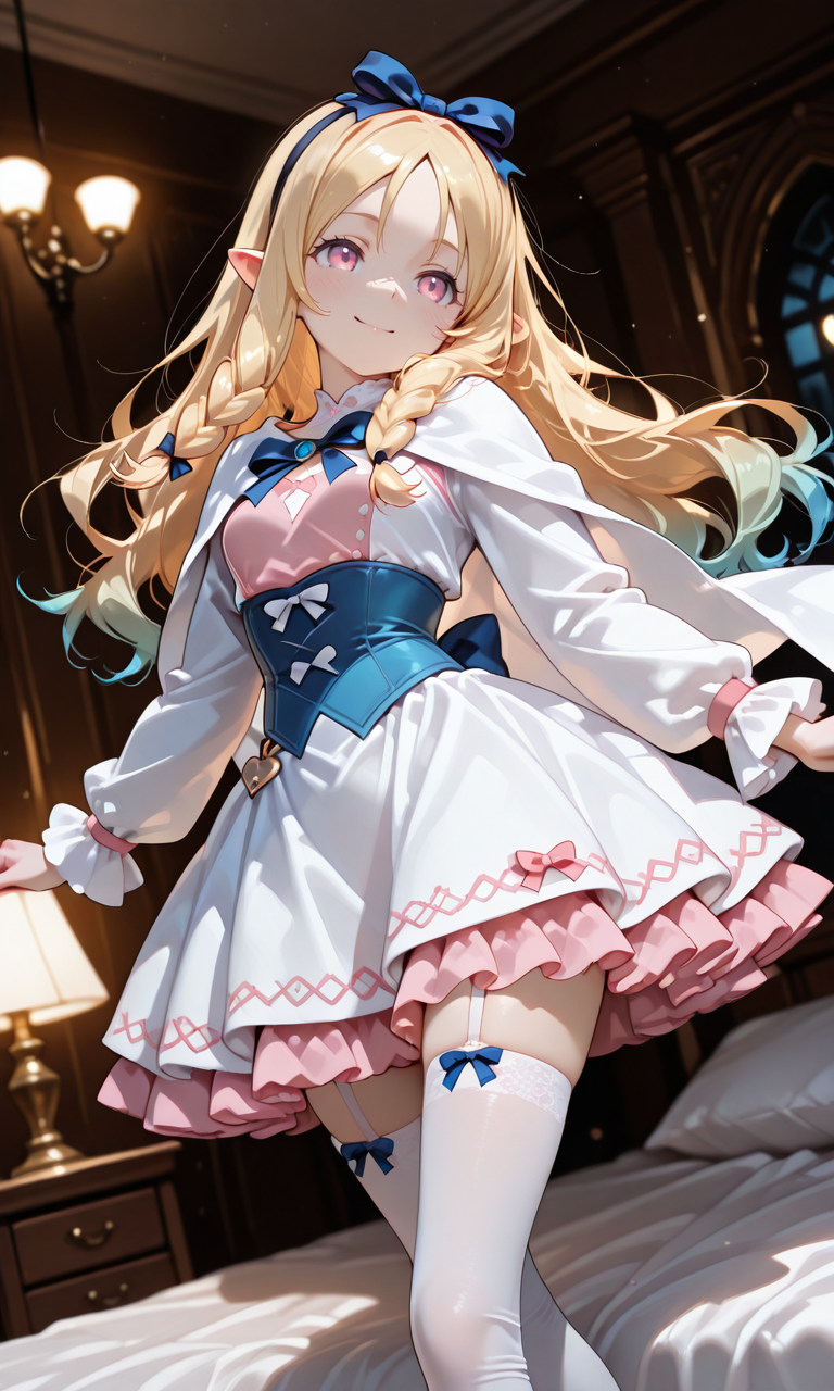 elf yamada, small breast, blond hair, twin braids, front bangs, headband ribbon, white stockings, pink frilly dress,