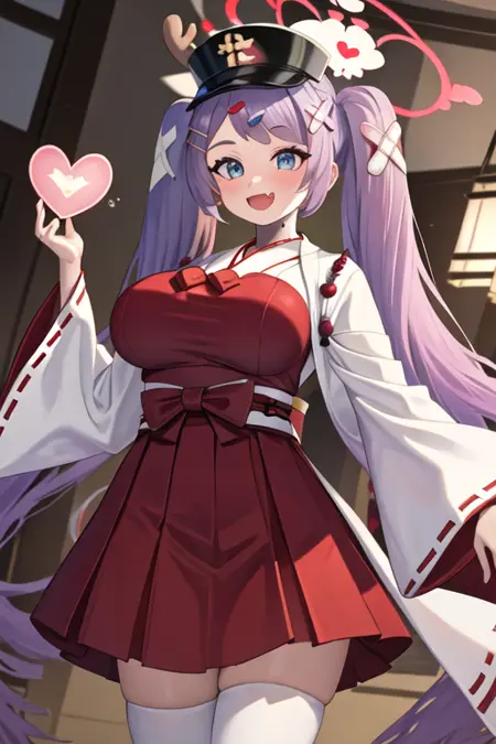 - The pruned character tags are purple hair, long hair, hair ornament, breasts, twintails, halo, blue eyes, hairclip, large breasts, fang, hat, skin fang, very long hair, nurse cap, bandaid hair ornament, heart hair ornament. You can add them into prompts when core features (e.g. hair color) of character is not so stable.