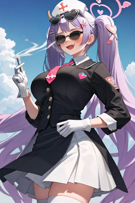 触发词为 hanae_bluearchive,被剪枝的标签为 purple_hair, long_hair, hair_ornament, breasts, twintails, halo, blue_eyes, hairclip, large_breasts, fang, hat, skin_fang, very_long_hair, nurse_cap, bandaid_hair_ornament, heart_hair_ornament。当某些特征(例如发色)在某些时候不稳定时,您可以将这些标签添加到提示词中。