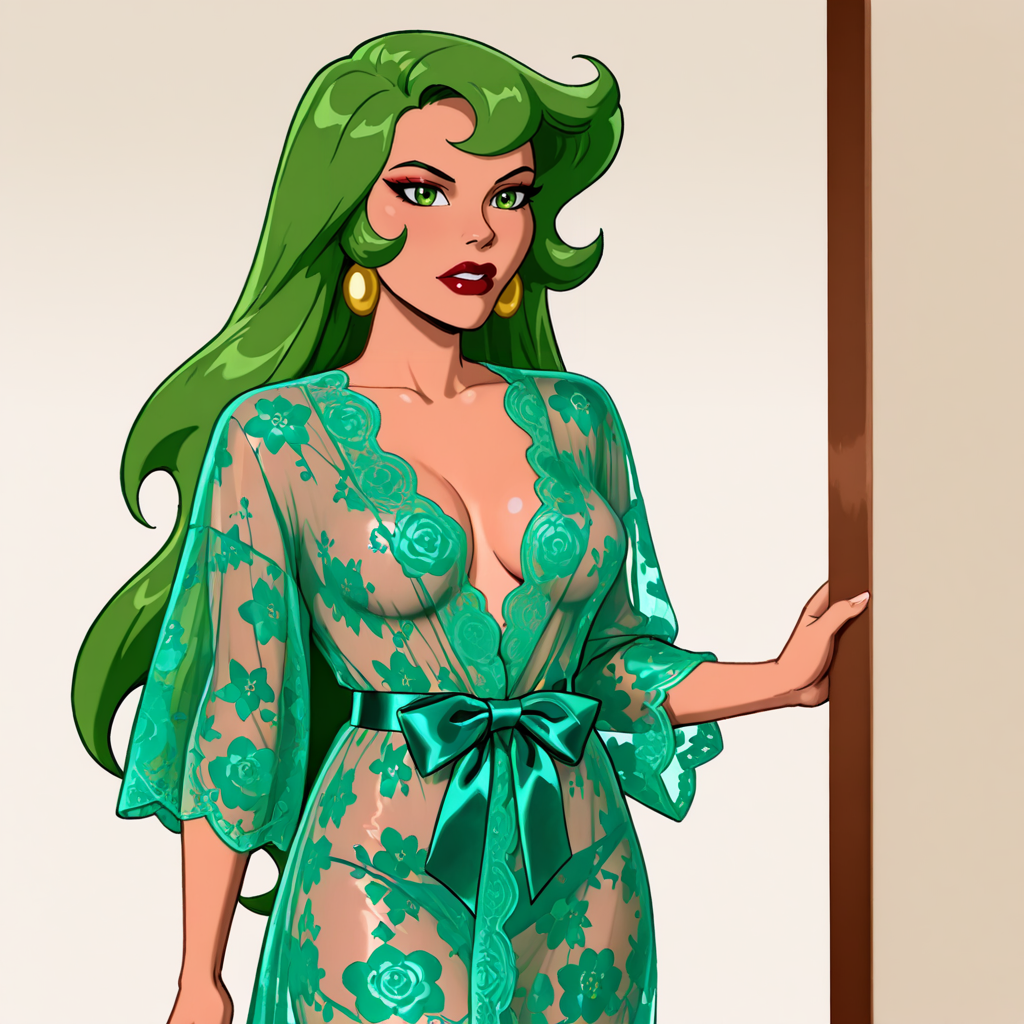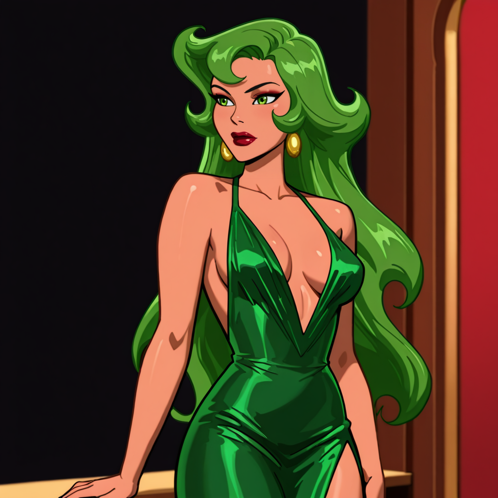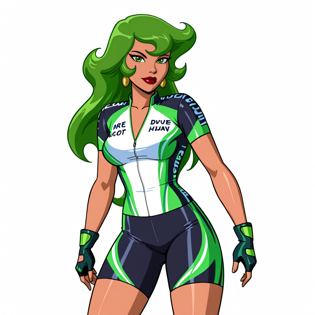 トリガー:FireBraveandTheBoldHuman, 1girl, 緑の髪, 緑の目, 緑の手袋, リップスティック, 化粧, ジュエリー, 中程度の胸, 緑のレオタード, ストッキング, 胸元の開き, ピアス, ネックレス