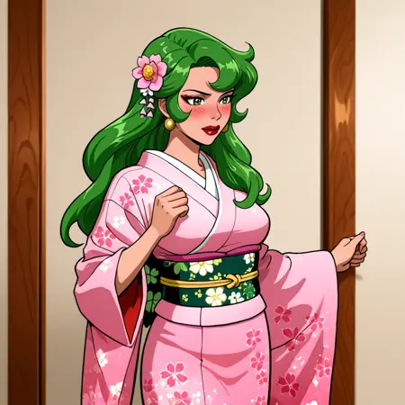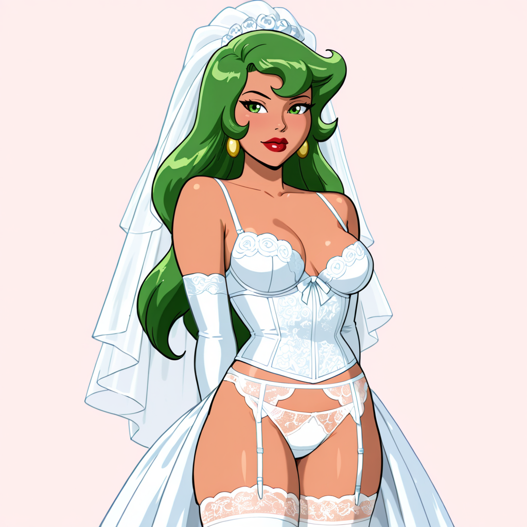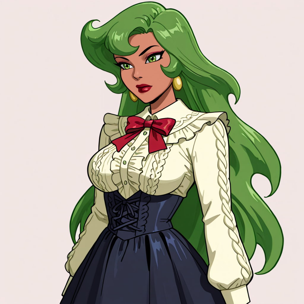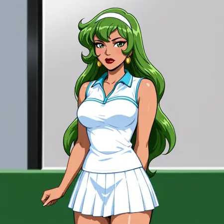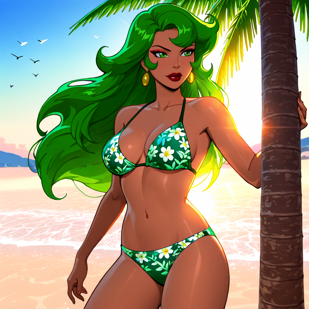 トリガー:FireBraveandTheBoldHuman, 1girl, 緑の髪, 緑の目, 緑の手袋, リップスティック, 化粧, ジュエリー, 中程度の胸, 緑のレオタード, ストッキング, 胸元の開き, ピアス, ネックレス