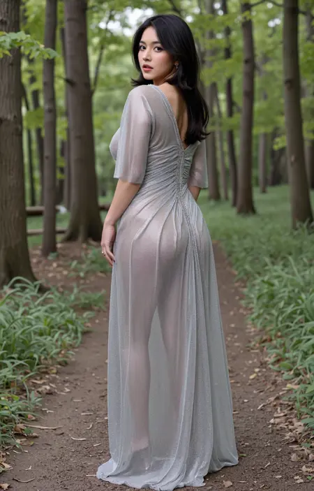 トリガー:シルバーのロングドレス、シルバーのドレス、シルバーの透けドレス、1人の少女、単体、黒髪、お尻、ジュエリー、イヤリング、観察者を見つめる、立っている、透けている、全身、透けたドレス、長い髪、開いた唇、黒い目、屋外、短袖、巨大な胸、森、横から、背中が切り取られた服