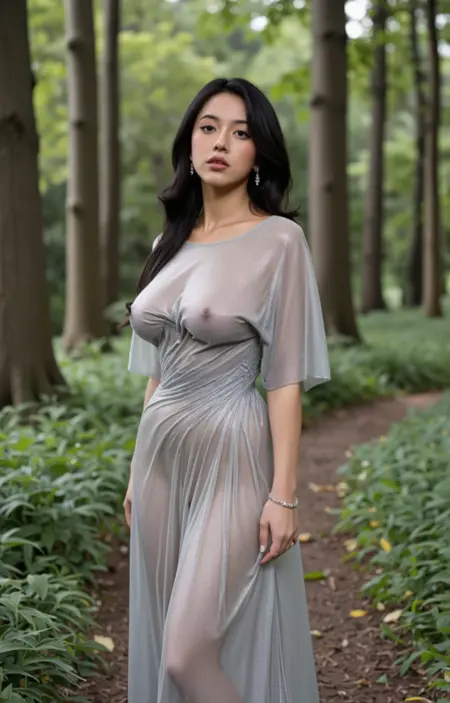シルバーのロングドレス、シルバーのドレス、シルバーの透けドレス、1人の少女、単体、黒髪、お尻、ジュエリー、イヤリング、観察者を見つめる、立っている、透けている、全身、透けたドレス、長い髪、開いた唇、黒い目、屋外、短袖、巨大な胸、森、横から、背中が切り取られた服