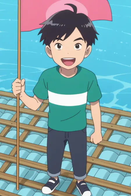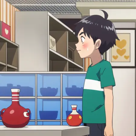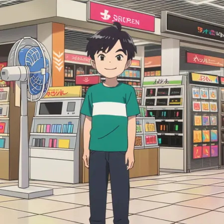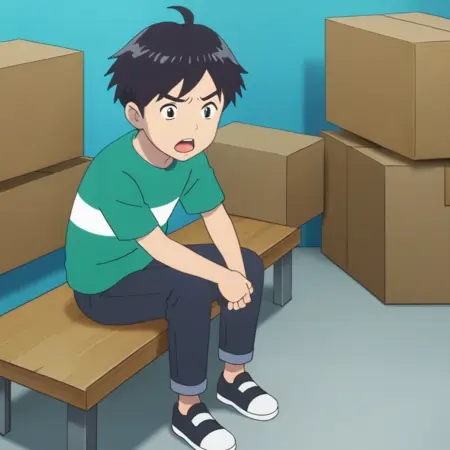 Prompts: male, black hair, ahoge, black eyes, t-shirt, pants, shoes, indoors (classroom/classroom window/curtains), indoors (mall/tile floor/stocked shelves/sign/table/couch/electric fan/television/cupboard/painting (object)/vase), indoors (hallway), indoors (factory/blue wall/bench/cardboard box), indoors (shrine/tatami/sliding doors), outdoors (school/sky/cloud/gate/greenery/school window), pink background/gradient background/polka dot background/bubbles