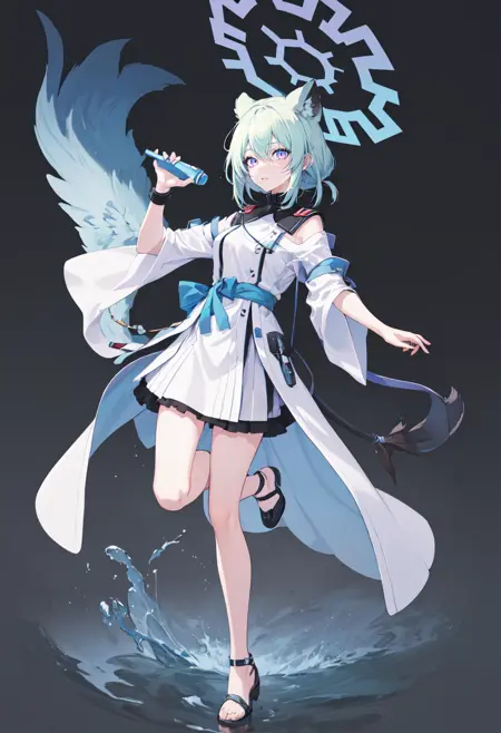 - 정제된 캐릭터 태그는 동물 귀, 홀로, 족제비 귀, 보라색 눈, 녹색 머리카락, 가슴, 단발, 눈 사이의 머리카락, 파란색 홀로, 꼬리, 족제비 꼬리, 중간 가슴, 큰 가슴입니다. 캐릭터의 핵심 특징(예: 머리색)이 안정적이지 않을 때 이 태그들을 프롬프트에 추가할 수 있습니다.