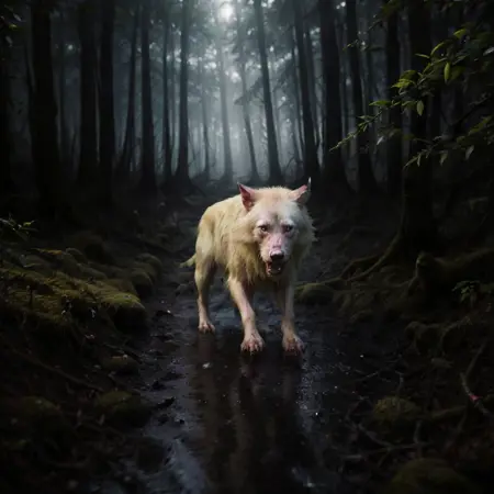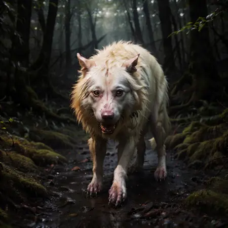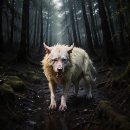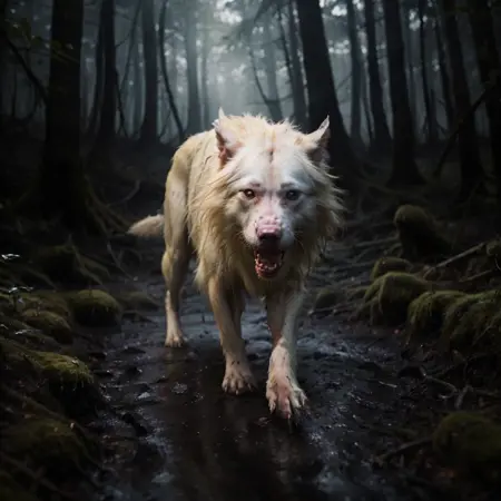 blink dog, blood, blue eyes, blurry, blurry background, claws, closed eyes, depth of field, fangs, green eyes, jewelry, long distance, looking at viewer, mid distance, multiples, no humans, open mouth, portrait, realistic, solo, teeth, tongue, tongue out, walking, yellow eyes