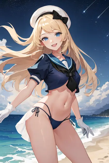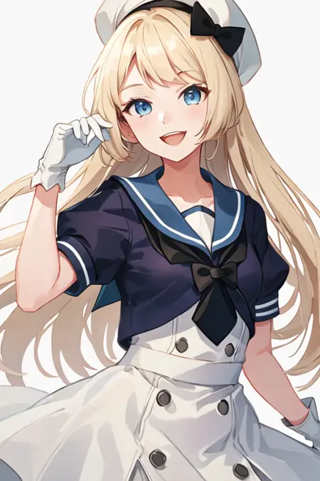 トリガー語はjervis_kantaicollection、推奨タグはbest quality, masterpiece, highres, solo, {jervis_kantaicollection:1.15}, blonde_hair, long_hair, blue_eyes, hat, white_headwear, sailor_hat, smile, open_mouthです。