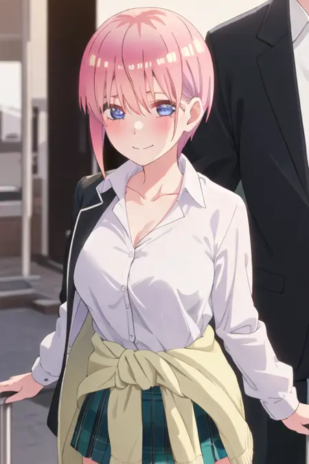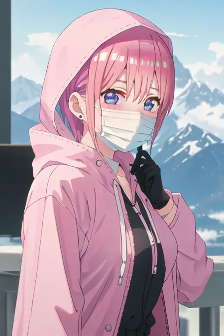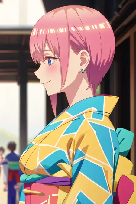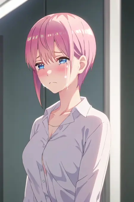 触发词为 nakano_ichika_gotoubunnohanayome,推荐标签为:best quality, masterpiece, highres, solo, {nakano_ichika_gotoubunnohanayome:1.15}, pink_hair, short_hair, bangs, blue_eyes, blush, hair_between_eyes, closed_mouth。