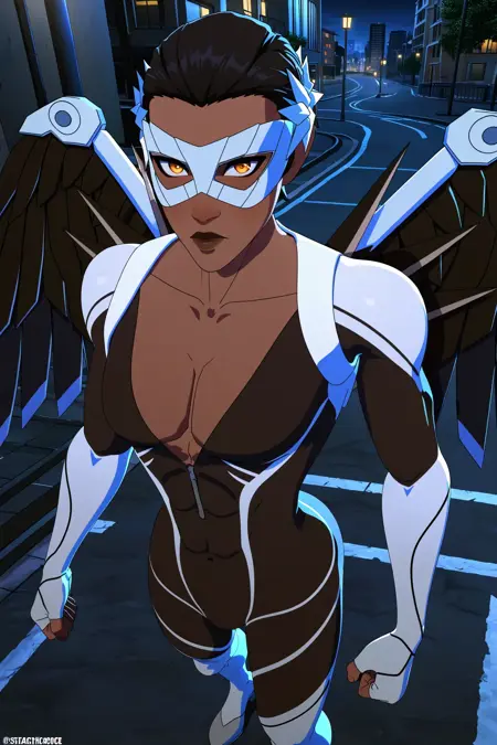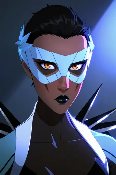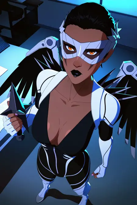 | 训练词汇 | 1girl, solo, animification, 3d,已复制! dispatchcoupe, dark skin, dark-skinned female, mask, amber eyes, black hair, short hair, very short hair, medium breasts, makeup, black lips, lipstick, black nails,已复制! black bodysuit, gloves, fingerless gloves, silver heel boots, black wings, feathered wings, collarbone, cleavage, spikes, holding weapon,已复制! |