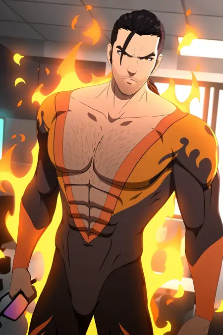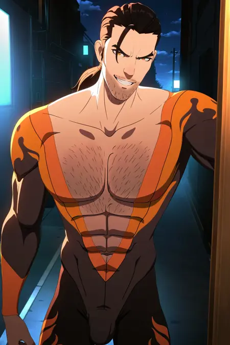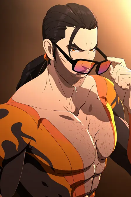 | 학습된 단어 | 1boy, male focus, solo, animification, 3d,복사됨! dispatchflambae, muscular, muscular male, pectorals, large pectorals, pectoral cleavage, abs, black hair, long hair, ponytail, orange hair tie, chest hair, stubble, facial hair,복사됨! sunglasses, tinted eyewear, bodysuit,복사됨! |