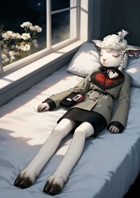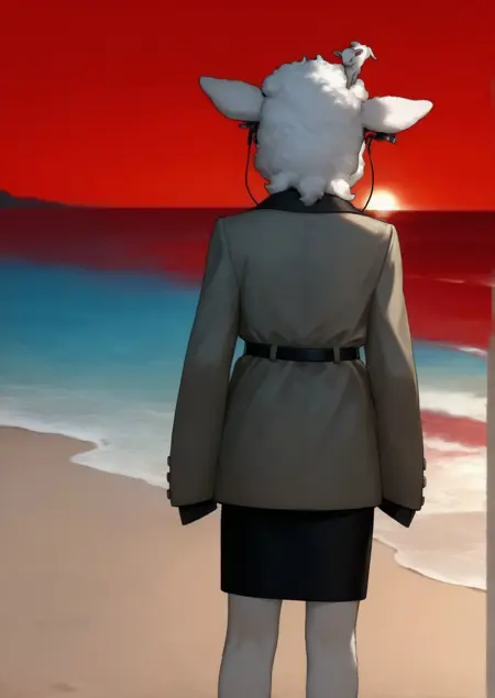 트리거 단어: 1girl, 퍼리 여성, 양 귀, 검은 리본 목걸이, 외투 위의 하트 모양 책, 신분증, 갈색 외투, 검은 벨트, 검은 치마, 양 발굽, 흰 털, 머리 위의 작은 양