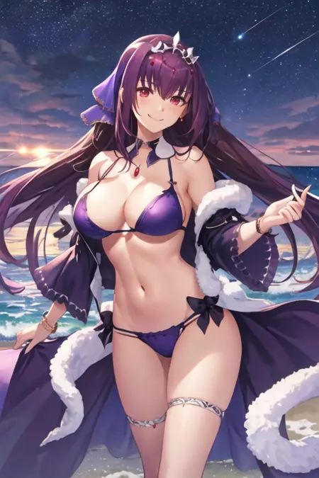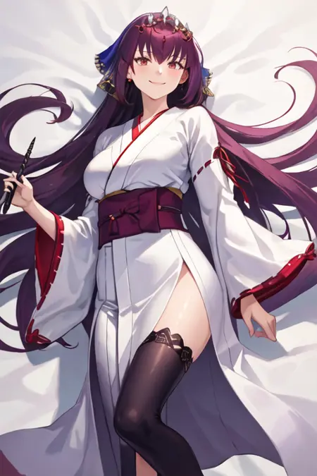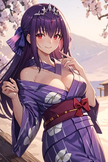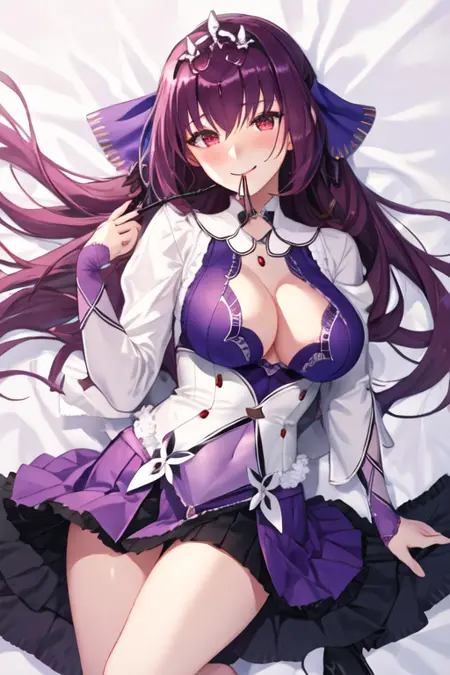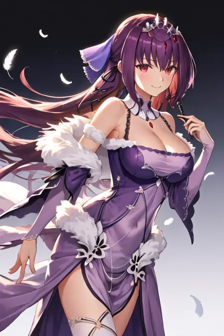 The trigger word is scathach_skadi_fgo, and the recommended tags are best quality, masterpiece, highres, solo, {scathach_skadi_fgo:1.15}, long_hair, purple_hair, red_eyes, bangs, hair_between_eyes, breasts, large_breasts, tiara, ribbon, smile, jewelry.