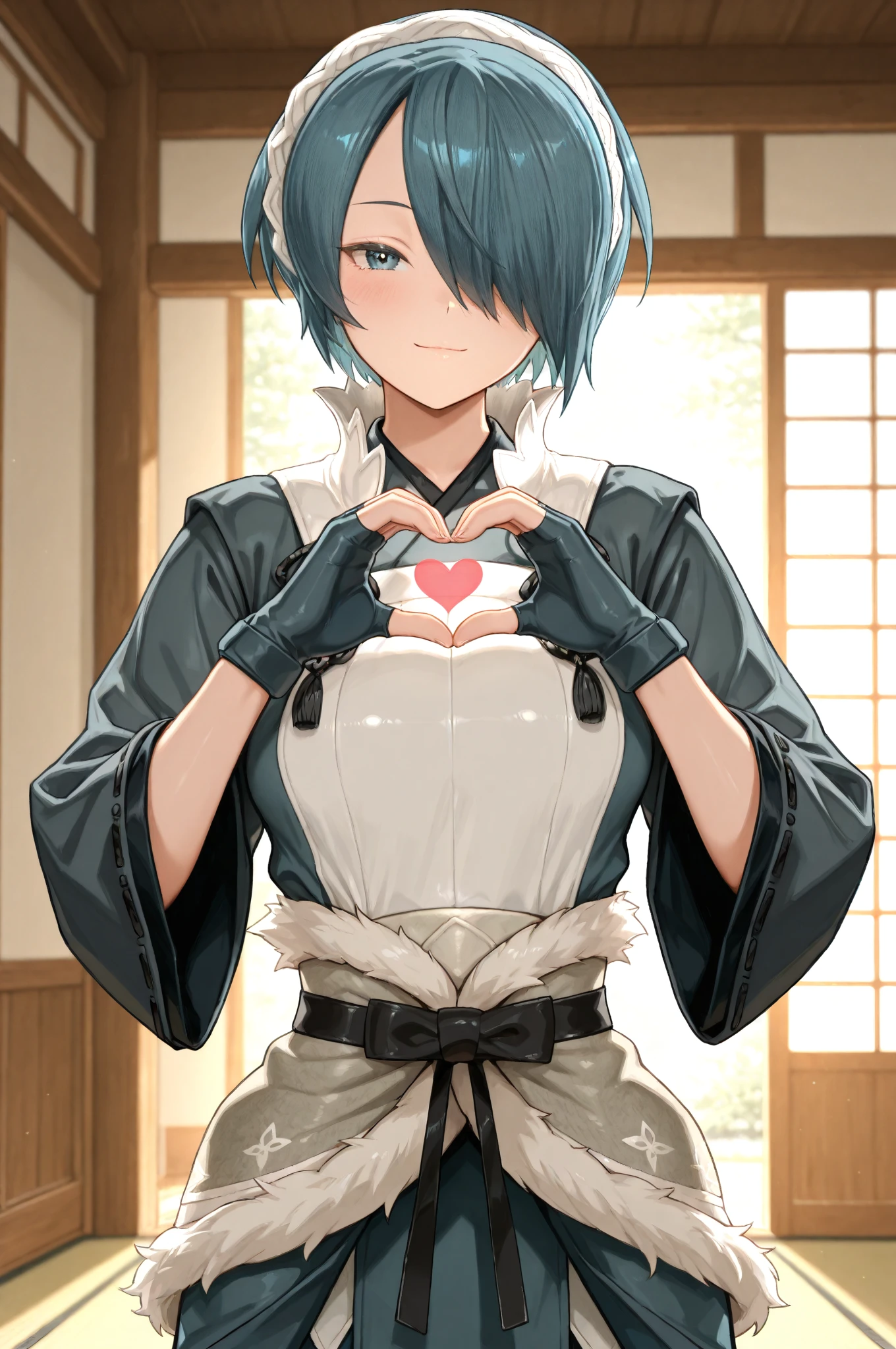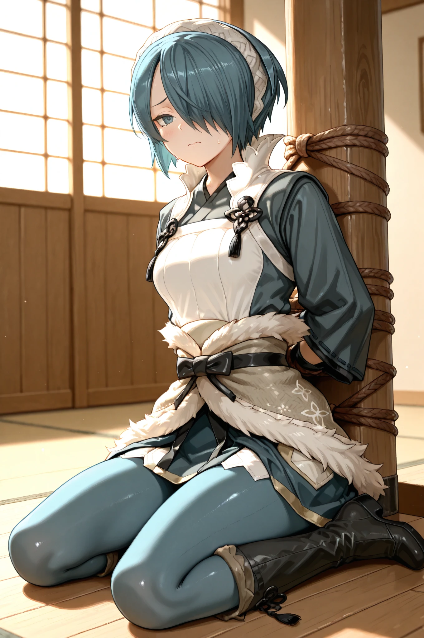 1girl, setsuna \(fire emblem\), short hair, blue hair, hair over one eye, hairband, japanese clothes, fur-trimmed sash, fingerless gloves, blue pantyhose, boots
