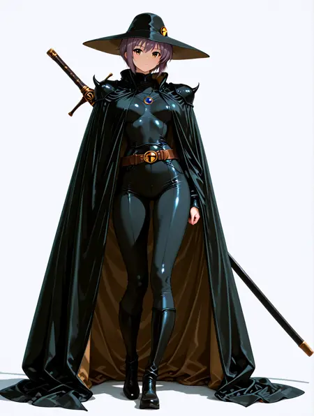 完整套装:Black hat, Hat ornament, Black cape, black-lined cape, long cape that trails, Black shoulder pads, Black bodysuit, Blue pendant, Hand guards, Brown sword belt, Brown belt, Black pants, Black boots,