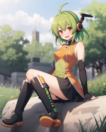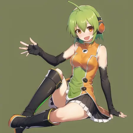 推荐的提示词:(flchan, 1girl, solo, 绿发, 手套, 无指手套, 靴子, 短发, 发呆角, 手肘手套, 坐着, 张嘴, 微笑, 橙色眼睛, 短裙, 耳机, 过膝靴, 脸红, 黑色手套)
