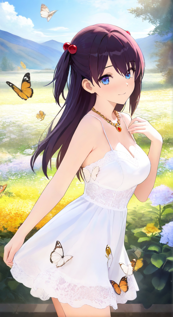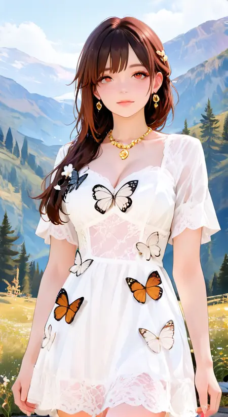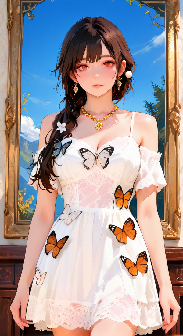 프롬프트 단어: buttery_dress, dress, butterfly, white dress, jewelry, necklace